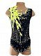 Неординарный купальник для художественной гимнастики для спортсменки ростом 128-134см. Изюминка костюма - объемная аппликация с добавлением бахромы, и щедрая россыпь пришивных и клеевых страз на классическом черном.